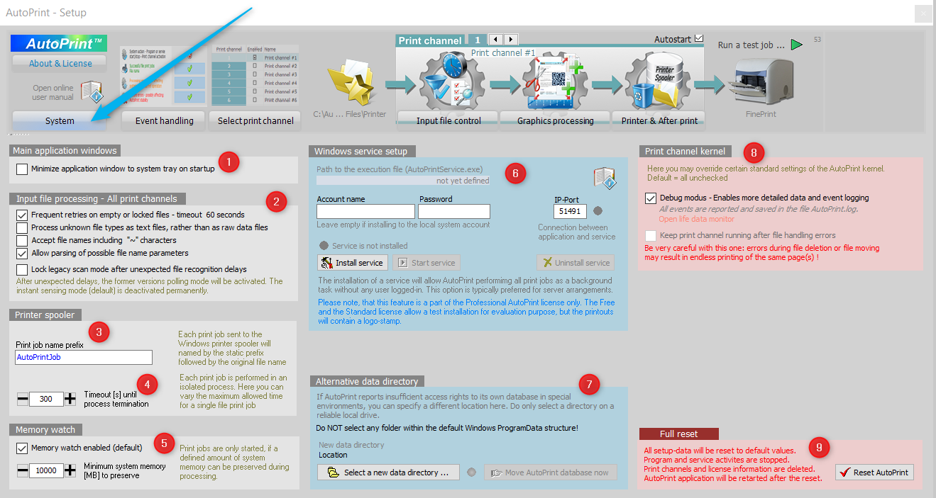 If you want to start all over and pretend you just installed AutoPrint you can launch a factory-reset right here. Be clear you want to do that as all previous settings and print channels you made are then gone. Nevertheless, for manual restoring the former setup you may save the AutoPrint.db file, which is located in the hidden Windows folder C:\ProgramData\AutoPrint8